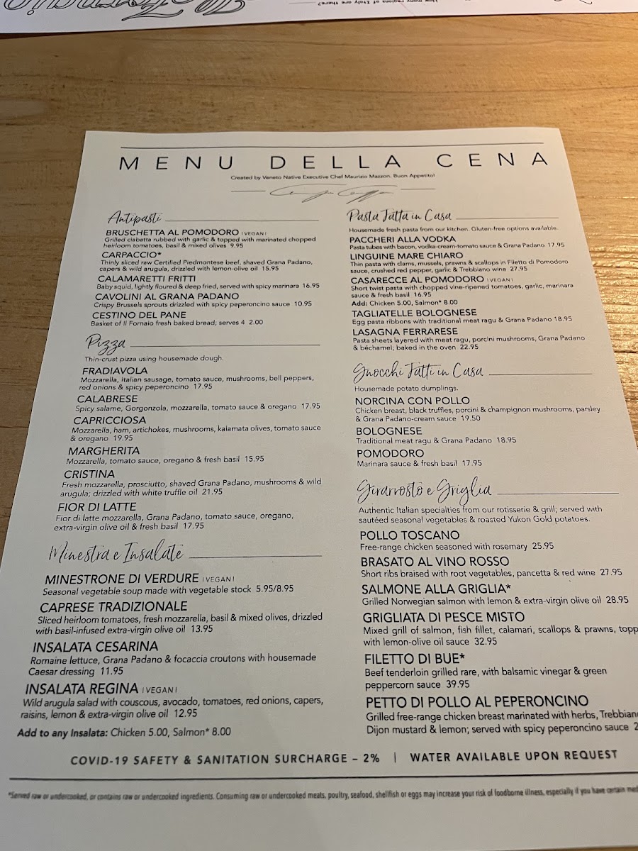 piedmontese beef | grana padano | capers | wild arugula | lemon olive oil *Served raw or undercooked, or contains raw or undercooked ingredients. Consuming raw or undercooked meats, poultry, seafood, shellfish or eggs may increase your risk of foodborne illness, especially if you have certain medical conditions.
