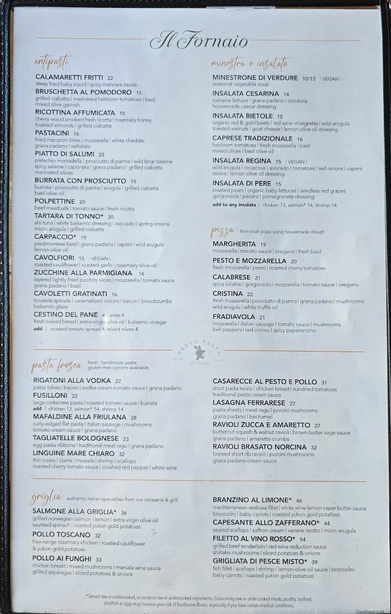 When you step into Il Fornaio, you're not just enjoying a meal; you're diving into an authentic Italian experience right in the heart of Burlingame, CA. The Il Fornaio Menu is a celebration of Italian flavors, offering a variety of dishes that will transport you straight to Italy. From freshly baked breads to hand-made pastas, every bite is crafted with care using high-quality ingredients. You’ll find classic favorites like creamy risottos and wood-fired pizzas, along with seasonal specials that highlight the best of what’s fresh and local. Whether you’re craving something rich and savory or light and refreshing, the menu has something for every taste. The inviting atmosphere of this cozy spot pairs perfectly with the thoughtful dishes, making it an ideal place to savor a meal with family or friends.
