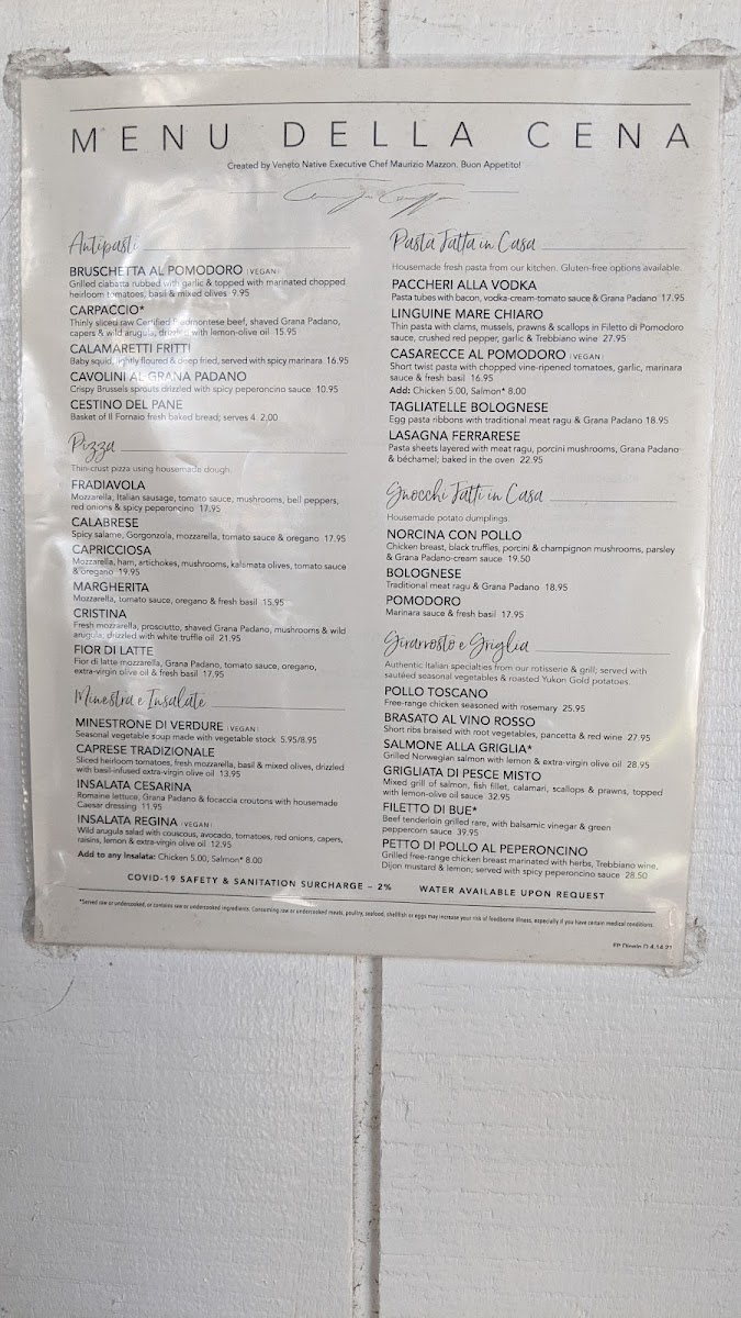 Features Salmone alla Griglia* & includes Insalata Cesarina, Rigatoni alla Vodka, Roasted Potatoes, Seasonal Vegetables, Freshly Baked Bread & Tiramisù